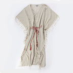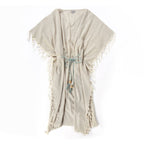 Μακρύ, κλειστό καφτάνι Charisma με ντεκολτέ V και σύνθεση από λινό, tencel και βαμβάκι. Λεπτομέρειες με κρόσσια και δέσιμο με κορδόνι που έχει ξύλινη λεπτομέρεια. Είναι άνετο και ελαφρύ καλοκαιρινό ρούχο που μπορεί να φορεθεί κάθε στιγμή της ημέρας.